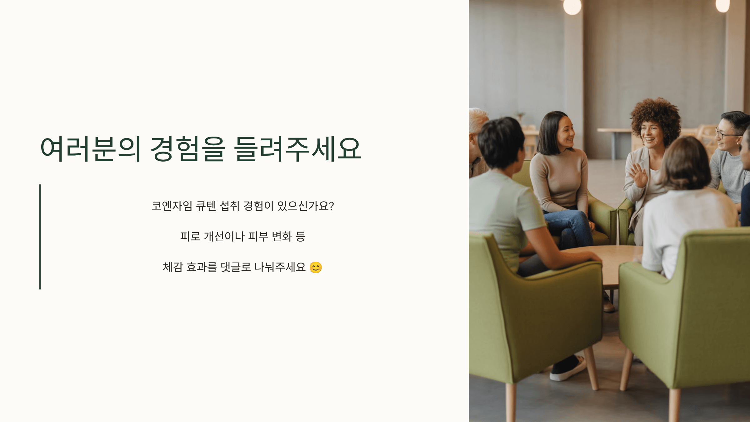 여러분들은 혹시 코엔자임 큐텐을 드셔보신 적 있으신가요? 피로 개선이나 피부 변화 같은 체감 효과가 있었는지 댓글로 경험을 나눠주시면 좋을 것 같아요 😊