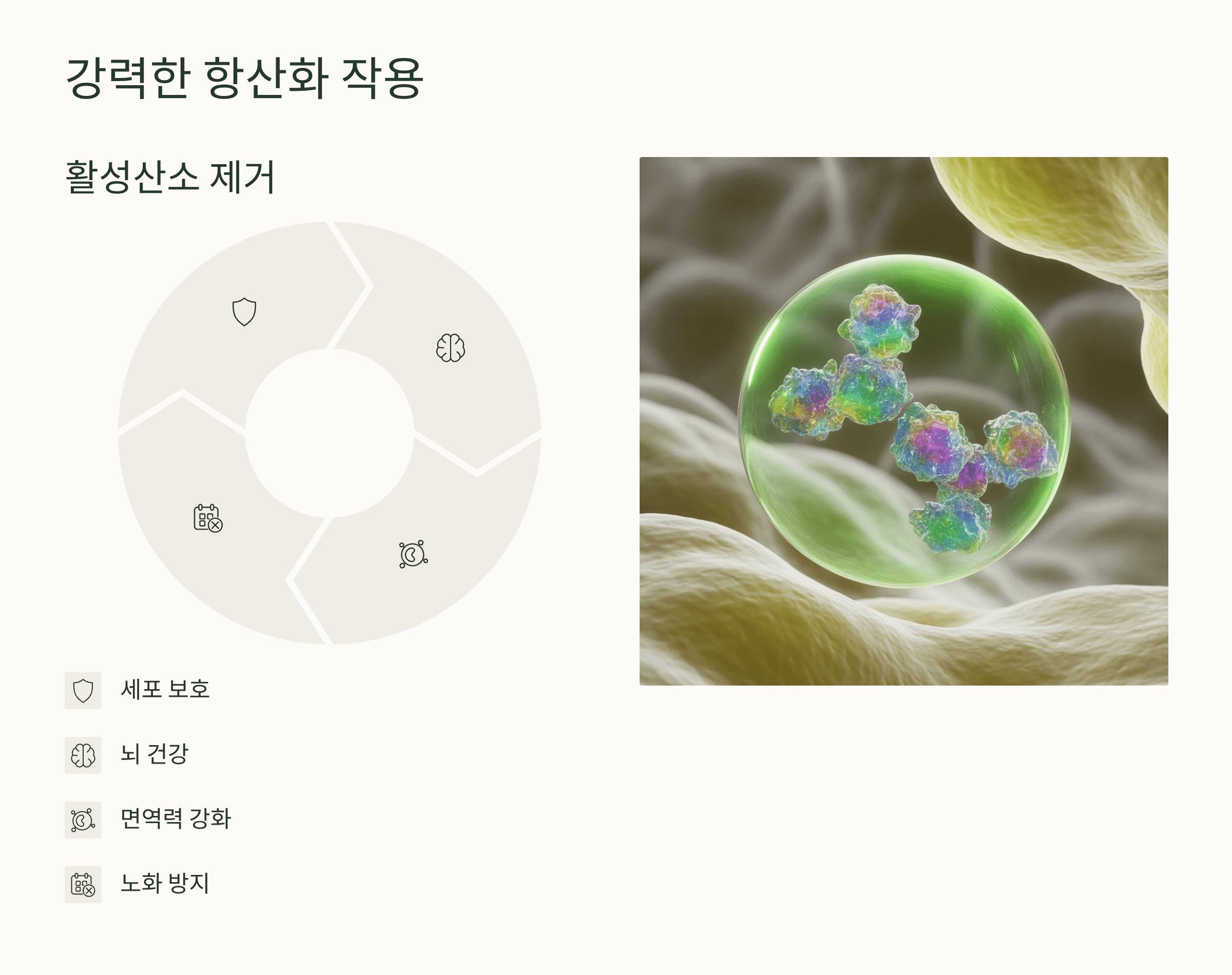 코엔자임 큐텐은 활성산소를 제거하는 강력한 항산화제이기도 합니다. 활성산소는 세포를 손상시키고 노화를 가속화시키는데, 코엔자임 큐텐이 이를 억제해 세포를 보호합니다. 덕분에 면역력 강화, 뇌 건강 유지에도 긍정적인 영향을 줍니다.