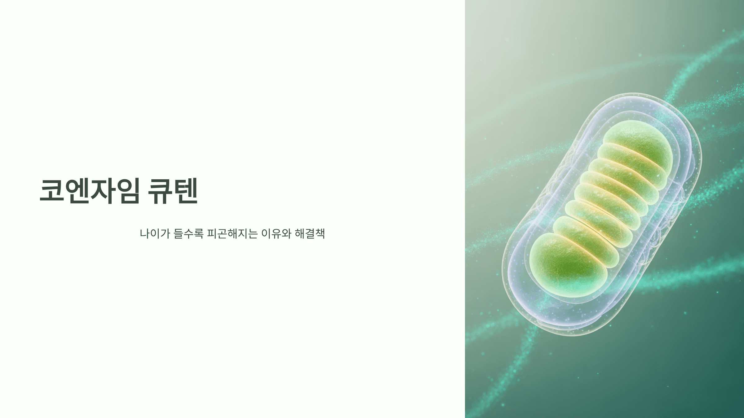 코엔자임 큐텐은 우리 몸의 세포 속 ‘미토콘드리아’에서 에너지(ATP)를 만드는 데 꼭 필요한 보조효소입니다. 쉽게 말해 세포가 움직이게 해주는 ‘엔진 오일’ 같은 존재예요. 원래는 체내에서 합성되지만, 나이가 들수록 생성량이 줄어들어 피로, 노화 현상이 나타납니다.