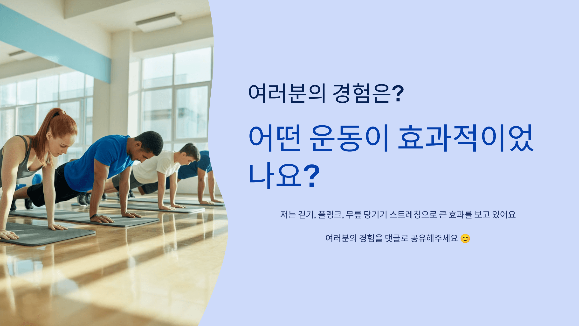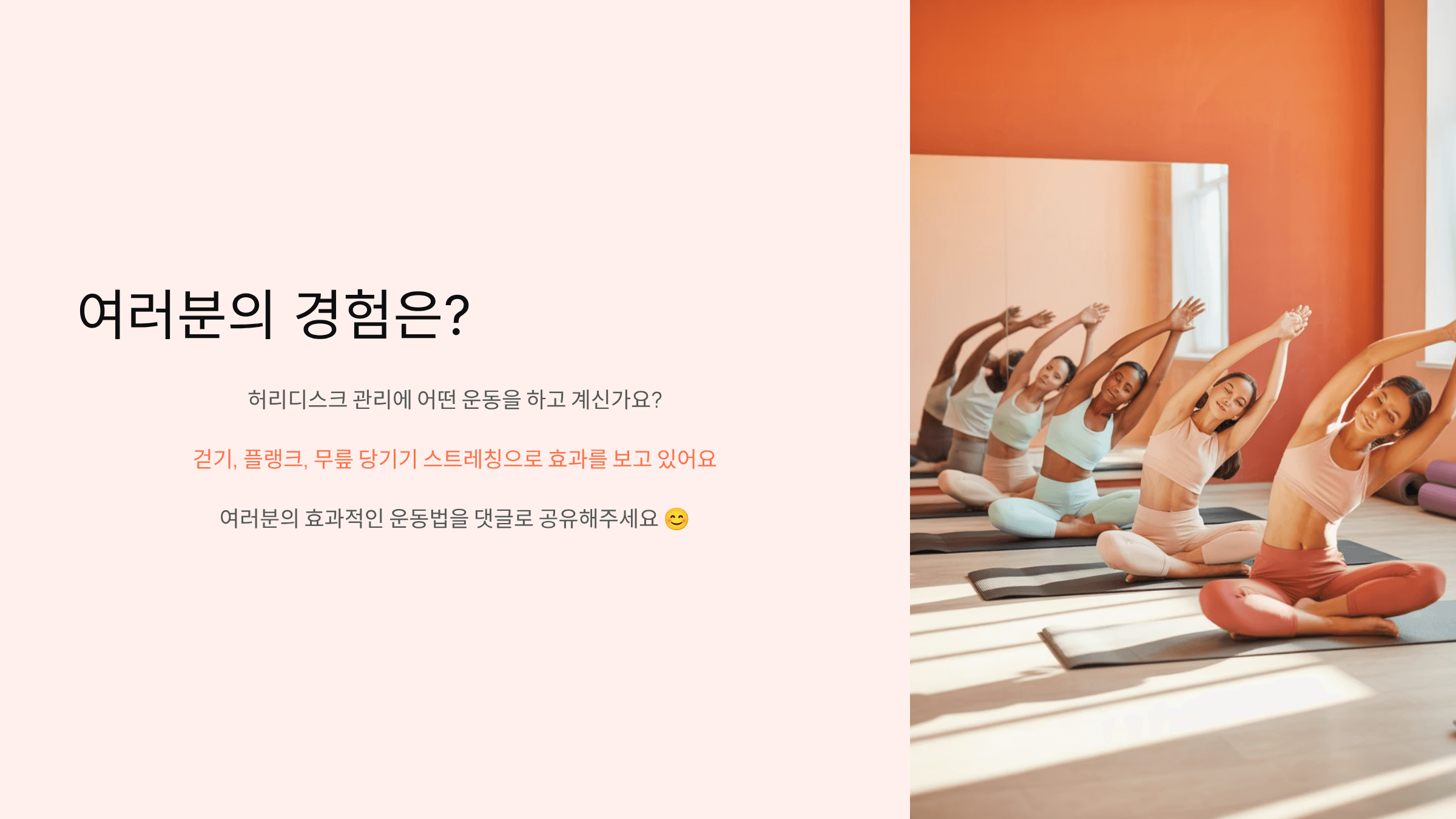 혹시 여러분은 허리디스크 관리에 어떤 운동을 하고 계신가요? 저는 걷기와 플랭크, 무릎 당기기 스트레칭을 꾸준히 하면서 큰 효과를 보고 있는데, 여러분은 어떤 운동이 가장 효과적이었는지 댓글로 공유해주시면 좋을 것 같아요. 😊
