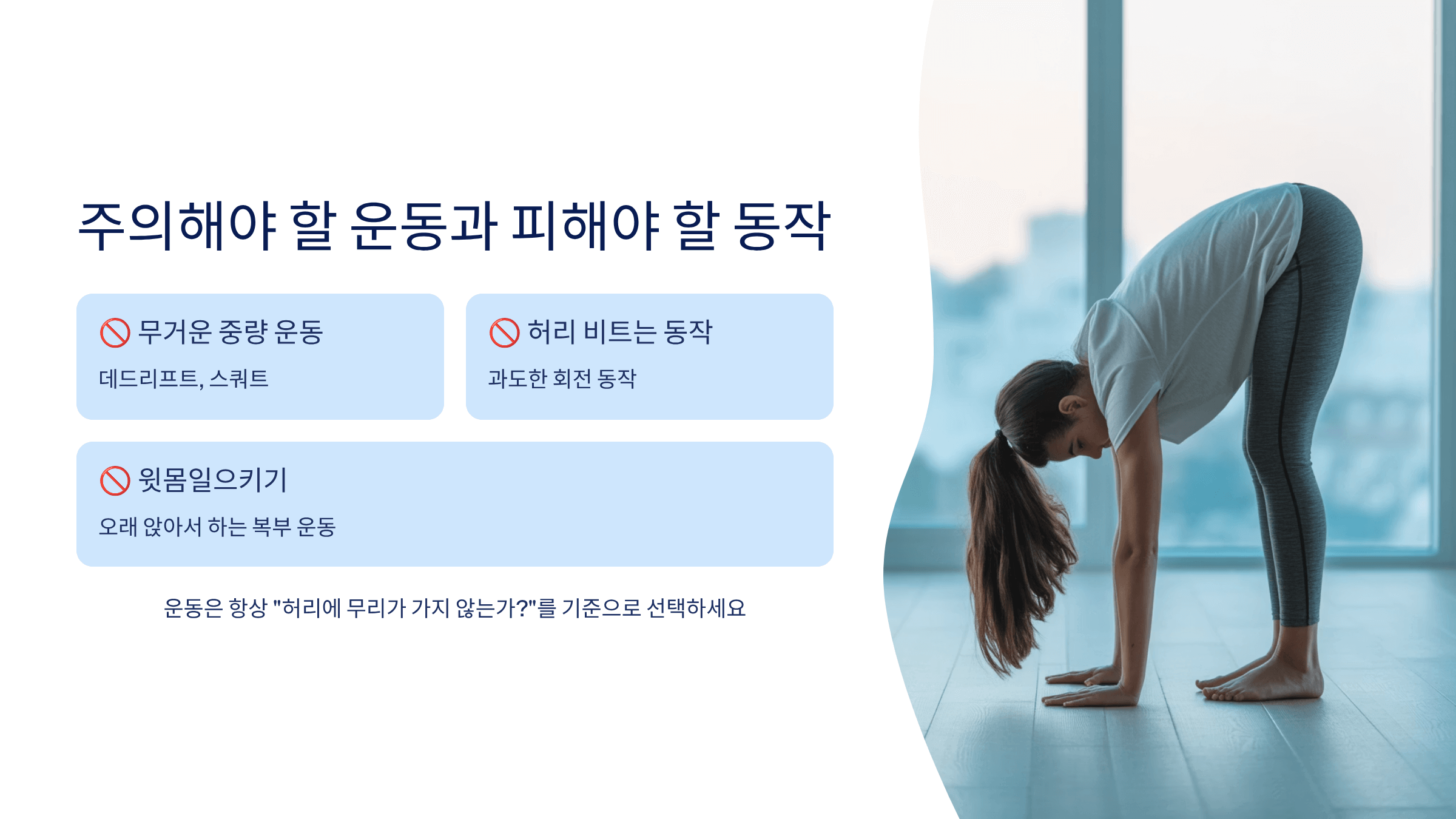 이런 운동은 허리에 큰 압력을 주기 때문에 피하는 게 좋습니다. 운동은 항상 "허리에 무리가 가지 않는가?"를 기준으로 선택해야 합니다.