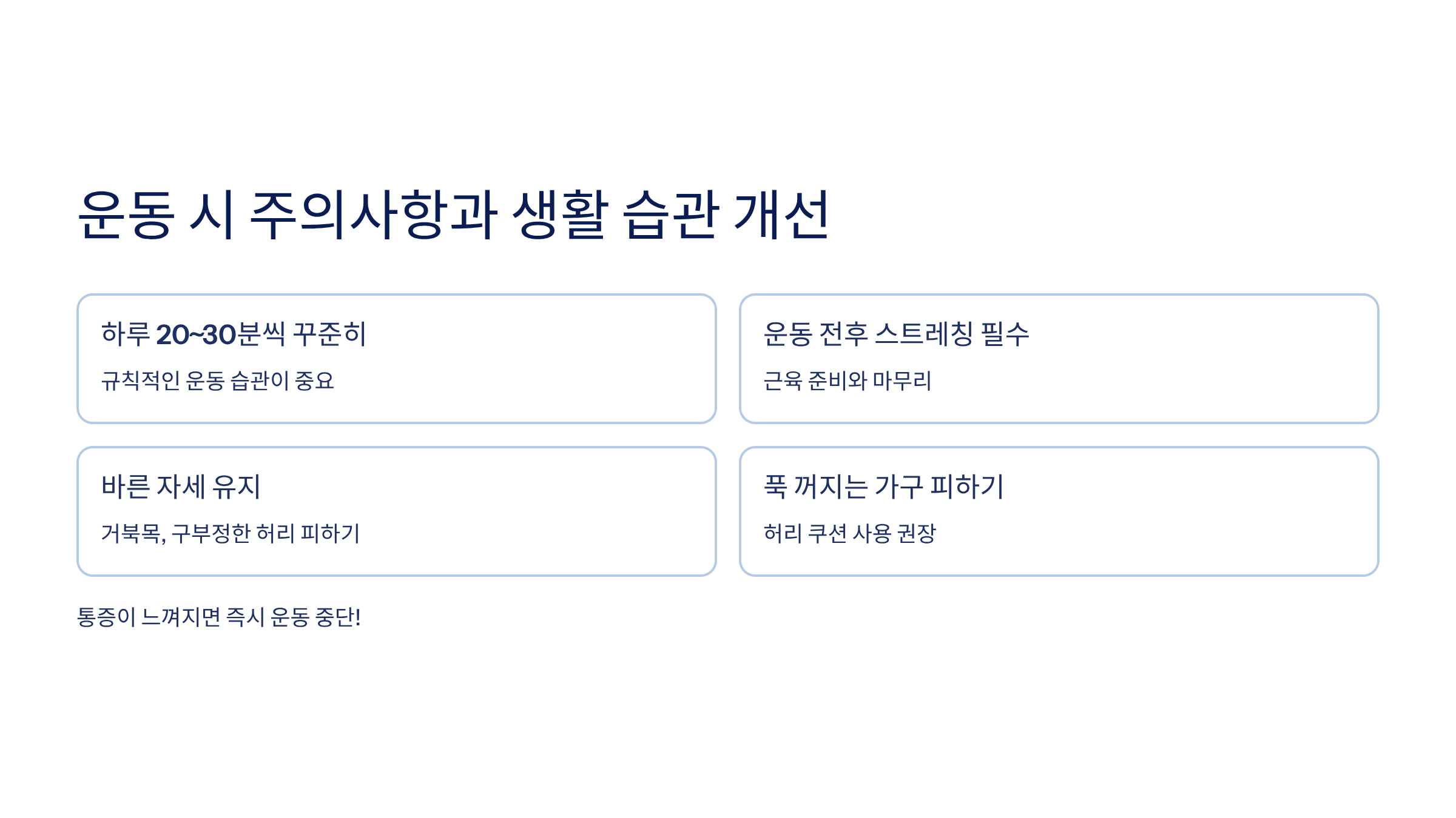 ➡️ 걷기, 수영, 스트레칭 같은 저충격 운동이 가장 좋습니다.