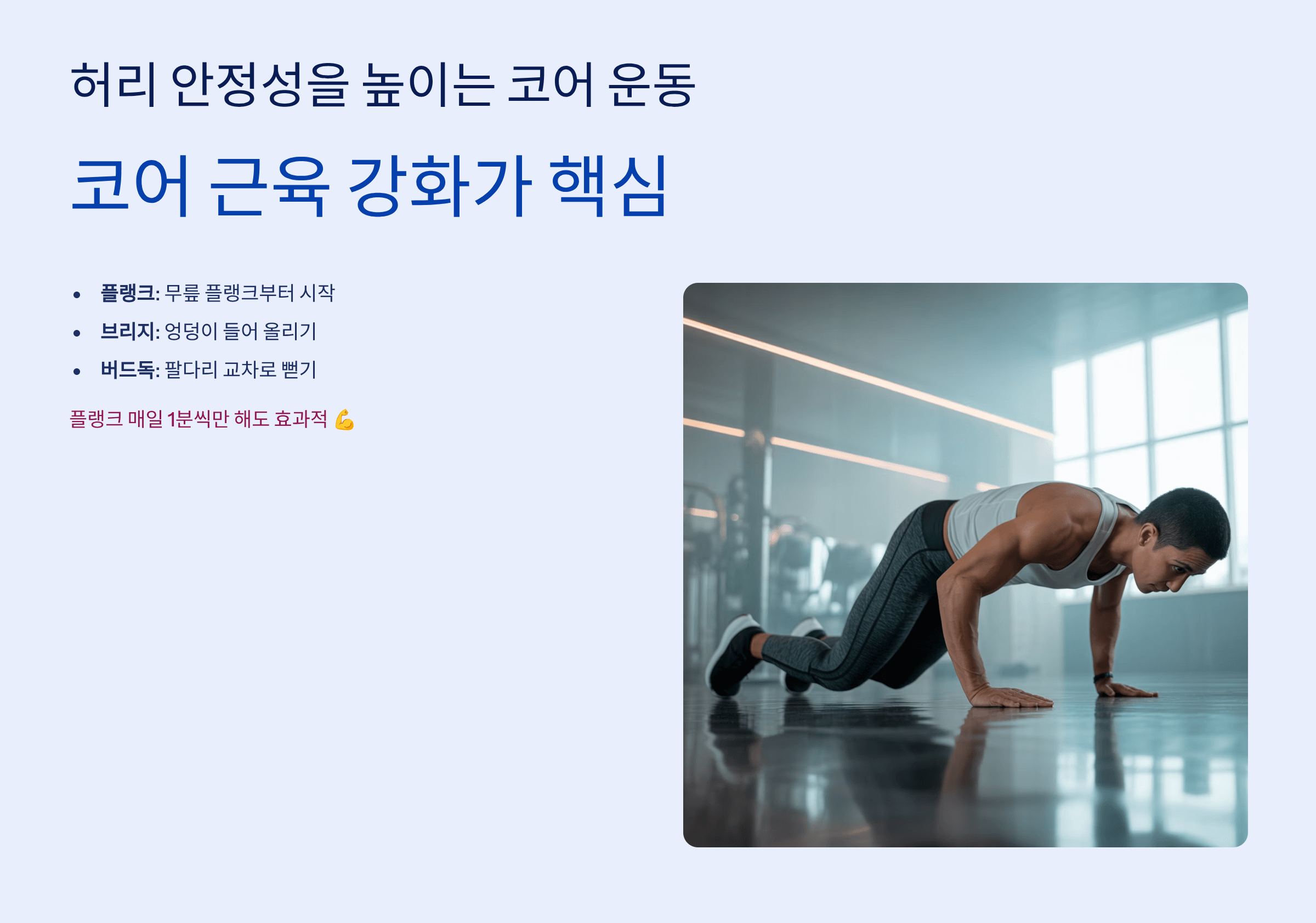 허리디스크 관리에서 가장 중요한 건 코어 근육 강화입니다. 복부와 허리 주변 근육이 튼튼해야 허리에 직접적인 부담이 줄어듭니다.