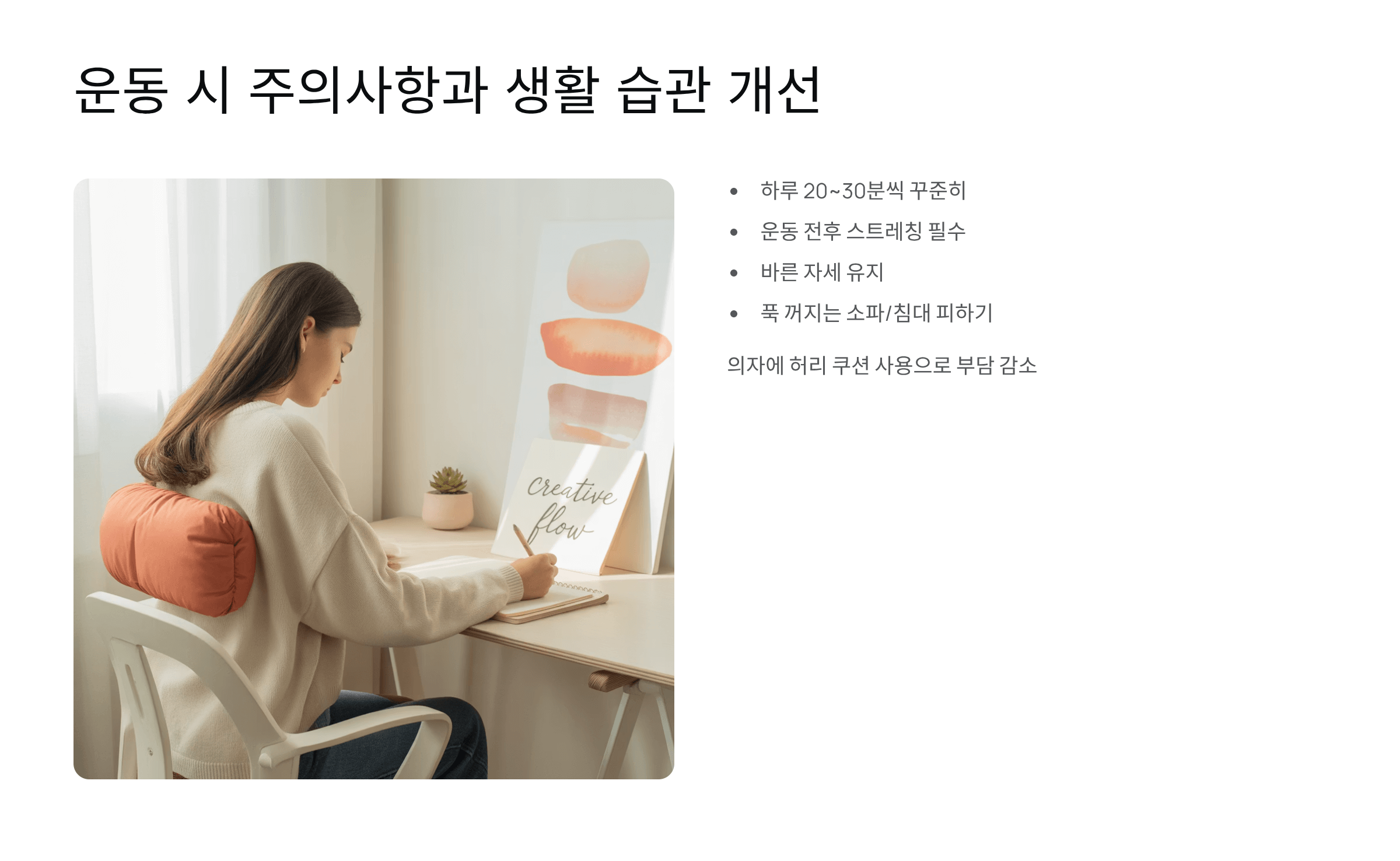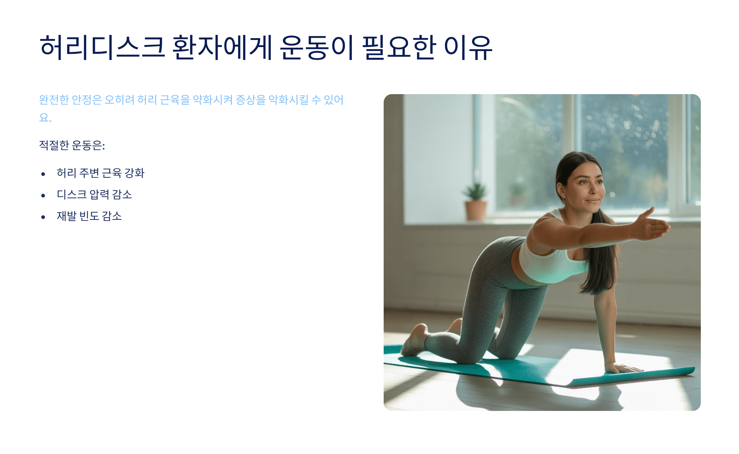 허리디스크가 있으면 "운동을 쉬어야 하지 않을까?"라는 생각이 먼저 듭니다. 하지만 완전한 안정은 오히려 허리 근육을 약화시켜 증상을 악화시킬 수 있어요. 적절한 운동은 허리 주변 근육을 강화하고, 디스크에 가해지는 압력을 줄여 회복을 돕습니다. 제가 운동을 꾸준히 하지 않았을 땐 통증이 쉽게 재발했지만, 규칙적으로 코어 운동을 하면서 재발 빈도가 확 줄었습니다.